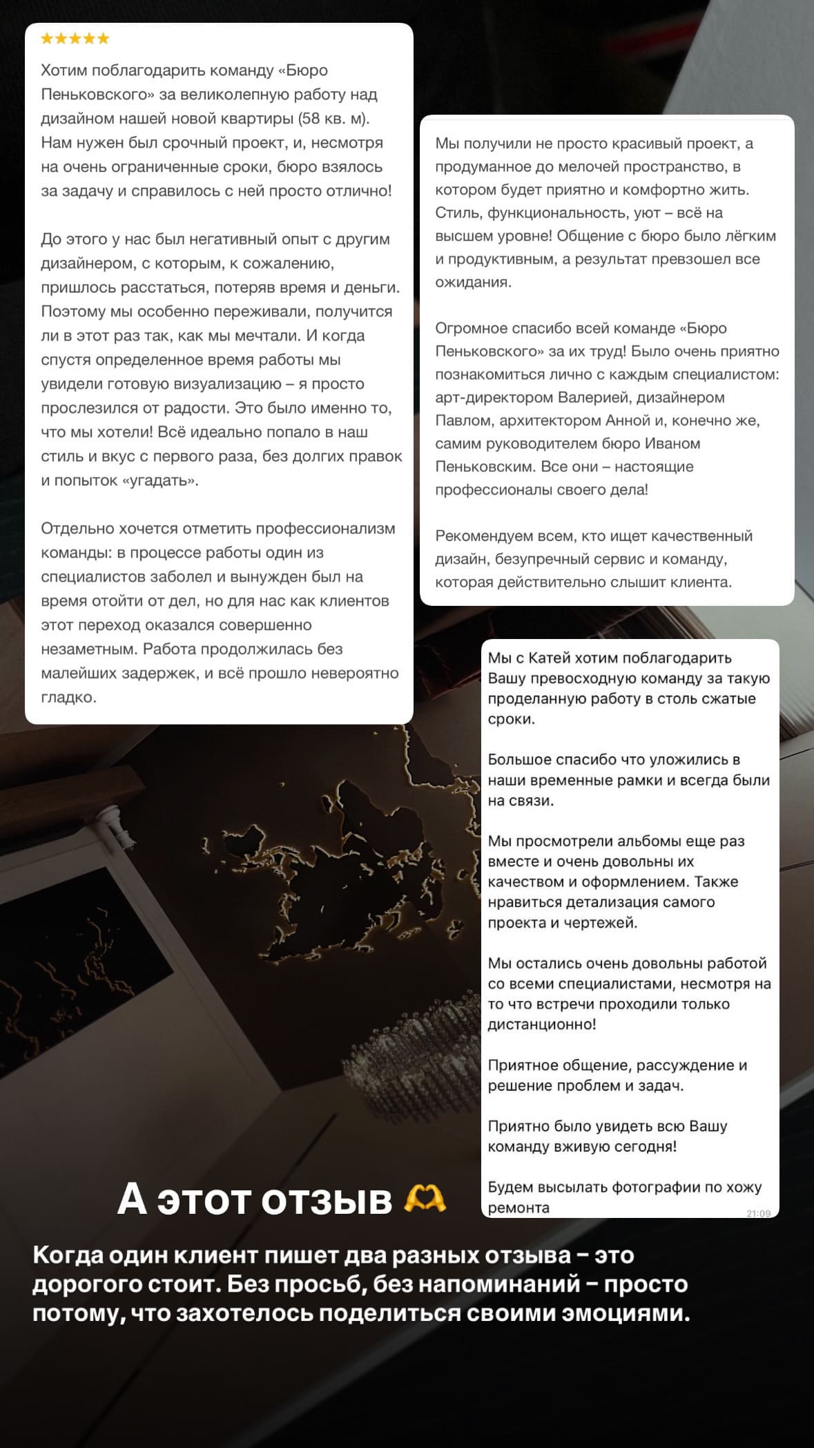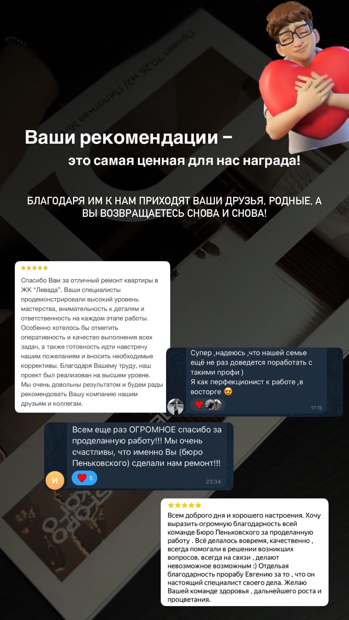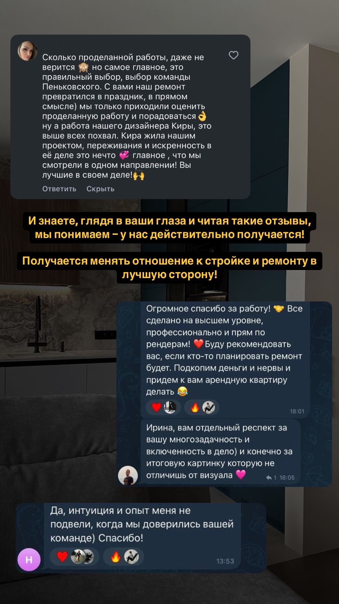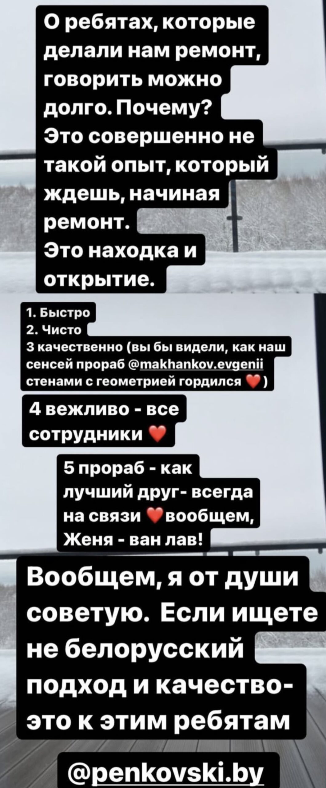 Делали ремонт с Иваном Пеньковским и его командой. Отлично налажена работа, все четко, все сроки соблюдены! После ремонта у вас ещё и гарантия на 5 лет на все выполненные работы, у нас по Беларуси так не работает никто! Нашу квартиру можно посмотреть на его сайте: penkovski.by/?post_type=works&p=1472 Можно посмотреть насколько всё продумано. Полина, дизайнер, продумала всё до мелочей, все наши требования учтены, всё полностью соответствует макету, который был нарисован в дизайн-проекте. Мы с мужем очень рады что наш ремонт прошел настолько комфортно!