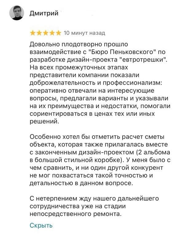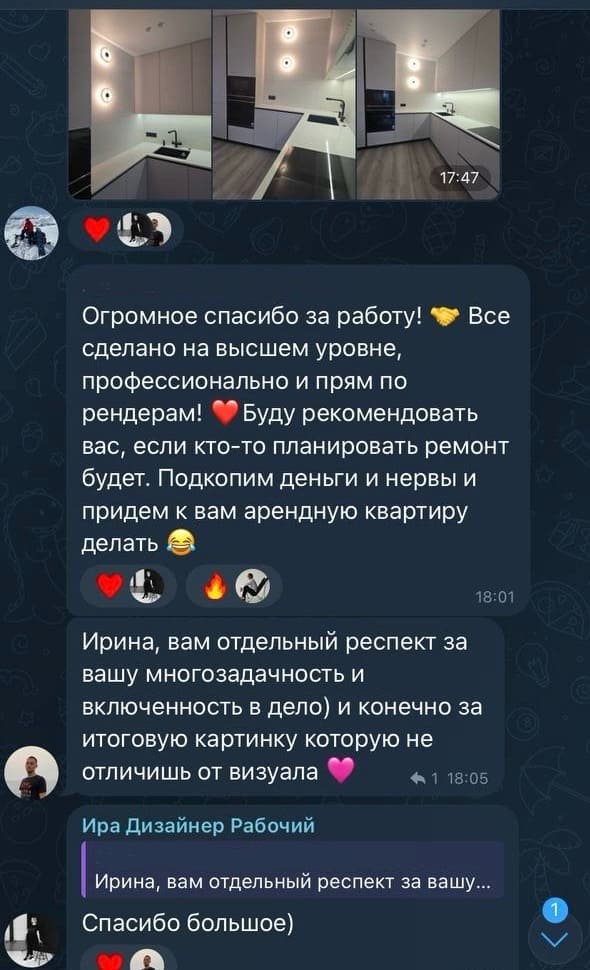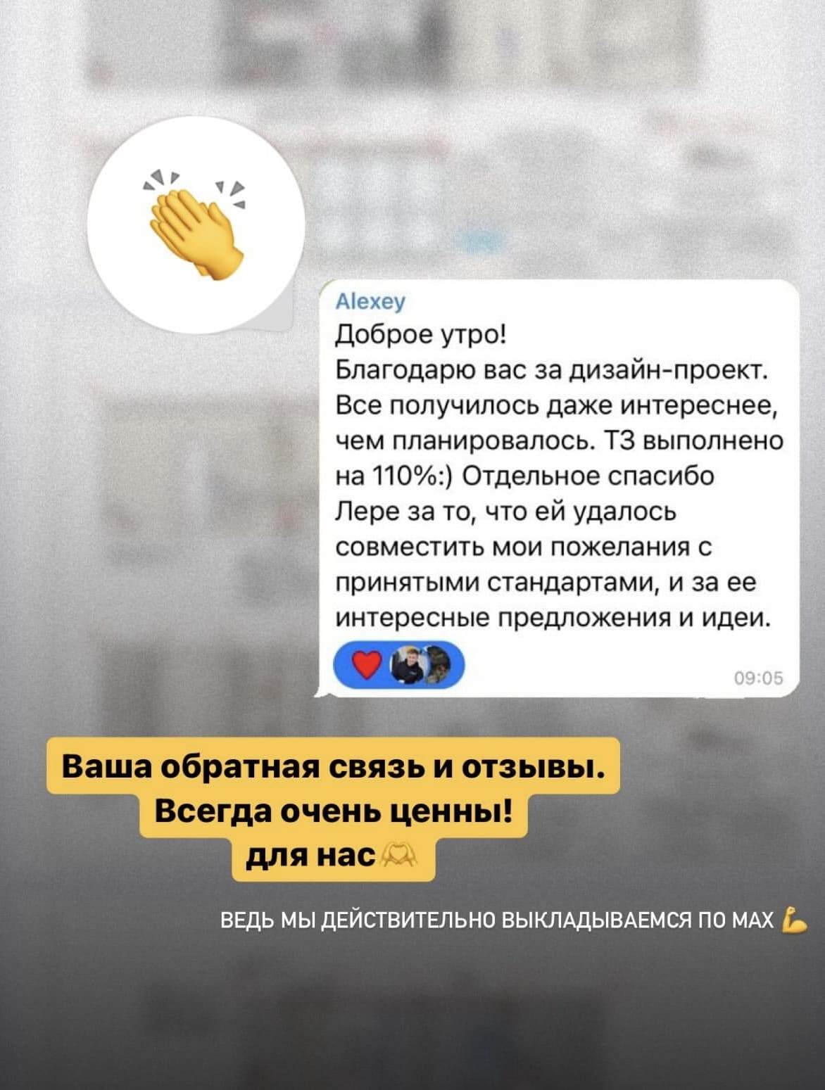 Долго выбирали компанию для ремонта с дизайном, цены за услуги были примерно одинаковые, но после личной встречи с Иваном выбор был очевидный: все объяснил, оценил что получится сделать в наш бюджет и во сколько обойдется полный ремонт по нашим референсам + предложил альтернативы, нет навязываний ненужного подороже, вы сами решаете стоит ли оно того. Сроки исполнения быстрее остальных, есть четкий тайминг каждого этапа который зафиксирован в документах + договор хорошо составлен по отношению к заказчикам + гарантия на услуги 5 лет. Профессиональный, порядочный, как человек очень лояльный и располагающий к себе, мы с мужем доверились ему и не пожалели. У него отличная команда, которую даже в Новой Боровой знали сотрудники и отзывались добрым словом. Рекомендую обращаться к проверенным ребятам в команде Ивана, не пожалеете точно.