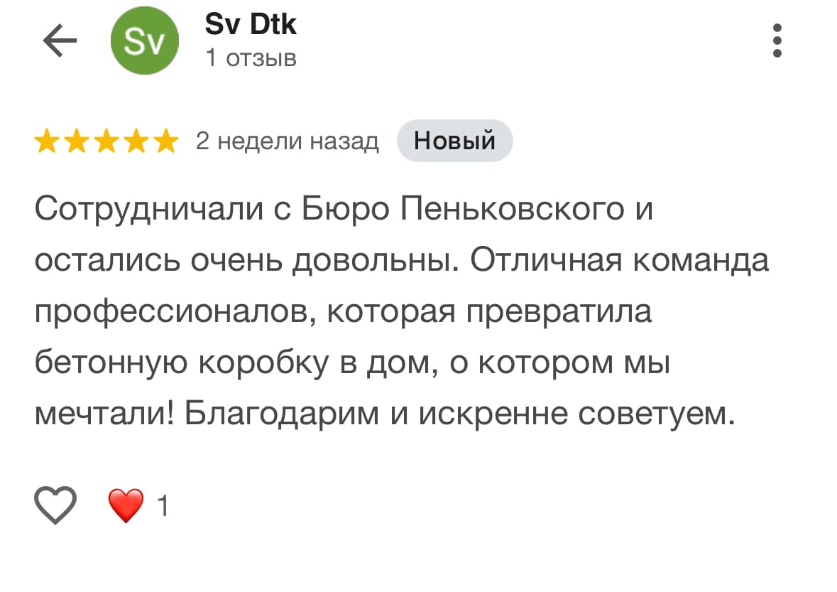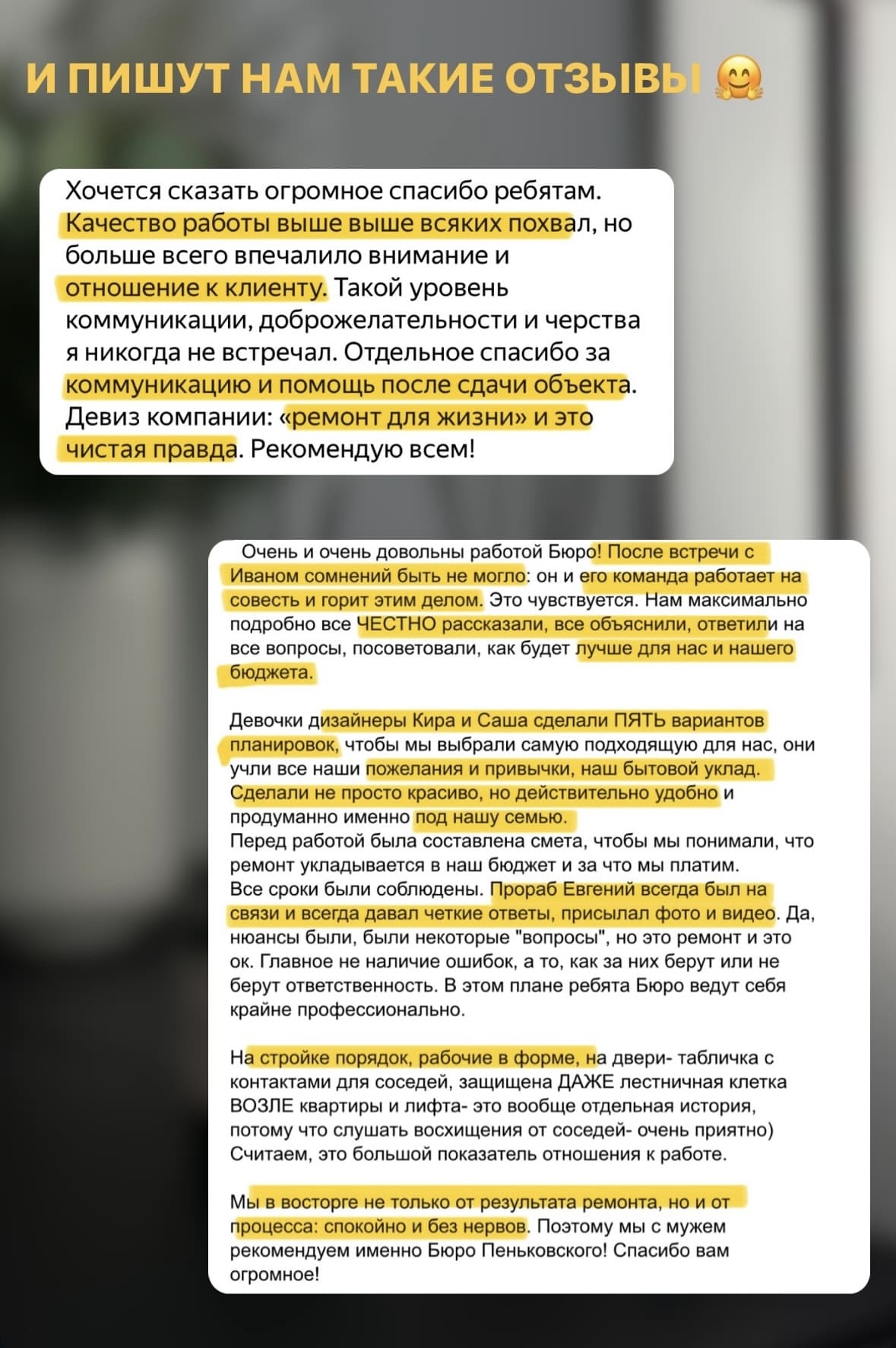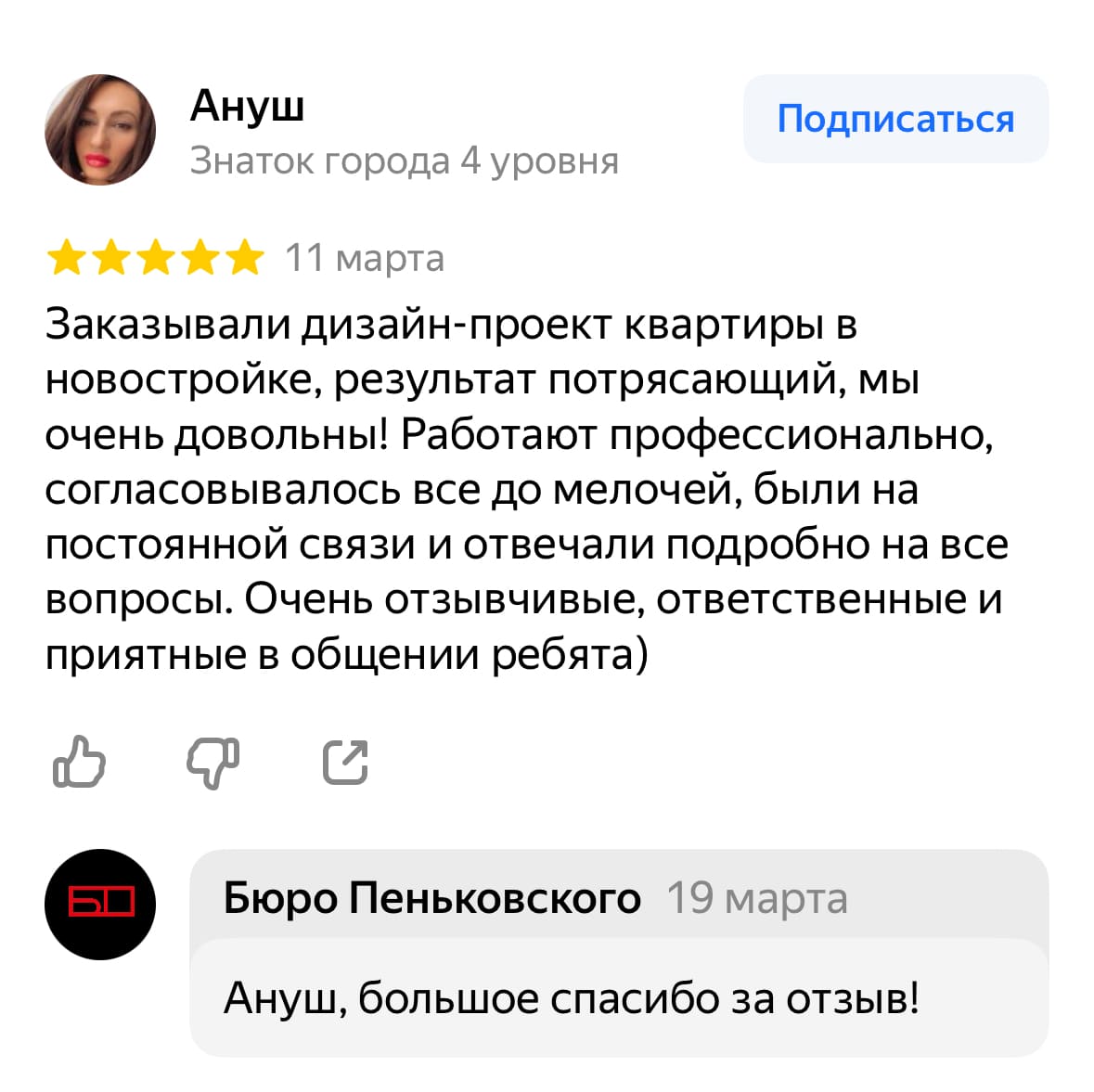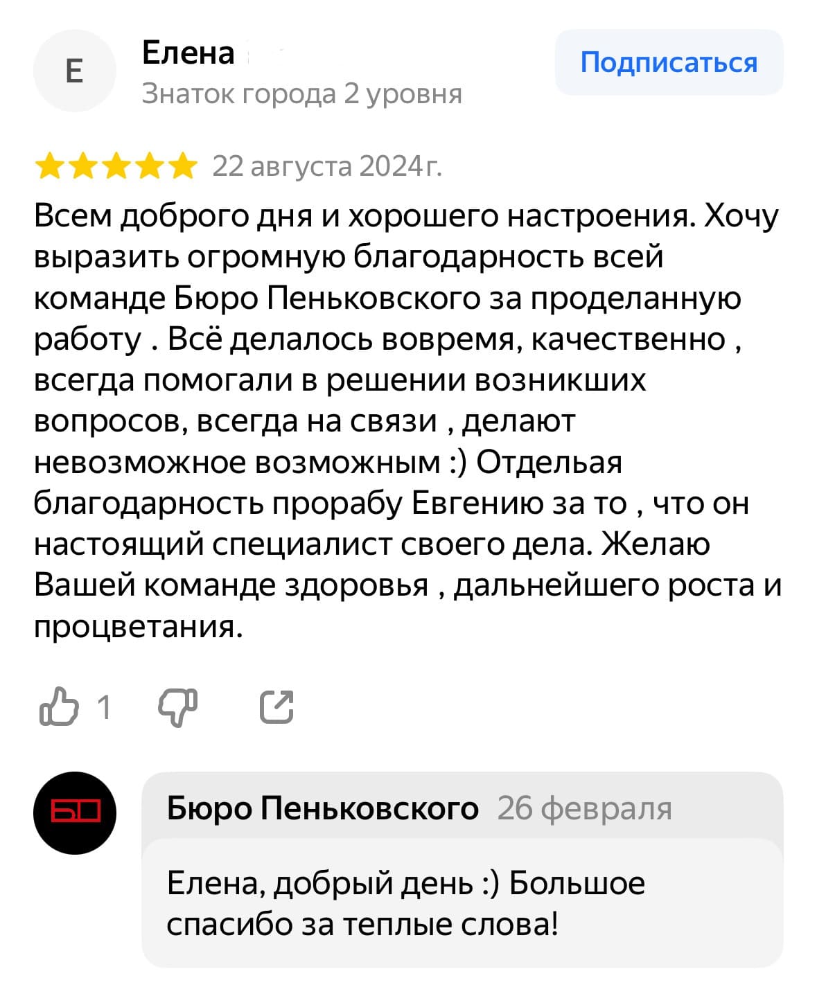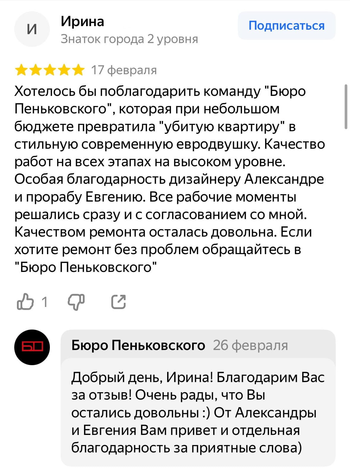 Сначала начали делать ремонт с мужем самостоятельно, в двухкомнатной квартире, через 3 месяца поняли, что это будет бесконечно. Когда поняли, что сами не можем даже стены выровнять, стали искать специалистов. Команда Бюро Пеньковского - отличные ребята! Всем советую! Цены на работы не поменялись, никаких скрытых доплат и прочих неприятных моментов при работе не возникло. Для меня было очень важно, чтобы исполнитель всегда был со мной на связи. Ещё в самом начале ремонта команда создала чат, в котором всегда отвечали на мои вопросы, присылали фото и видео. Очень благодарна ребятам, квартира изменилась до неузнаваемости! А в конце бонус, которого мы вообще не ожидали: гарантия на 5 лет! Т.е. я ещё 5 лет могу точно не беспокоиться что что-то отвалится и придется ремонтировать! Это нереально круто!
