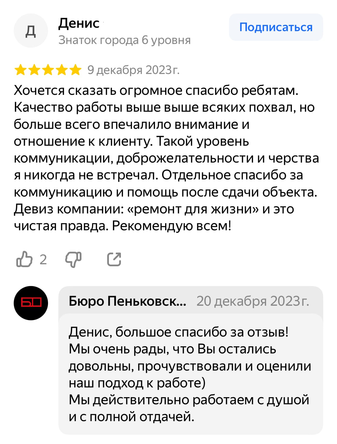 Хочется сказать огромное спасибо ребятам. Качество работы выше выше всяких похвал, но больше всего впечатлило внимание и отношение к клиенту. Такой уровень коммуникации, доброжелательности и черства я никогда не встречал. Отдельное спасибо за коммуникацию и помощь после сдачи объекта. Девиз компании: «ремонт для жизни» и это чистая правда. Рекомендую всем!