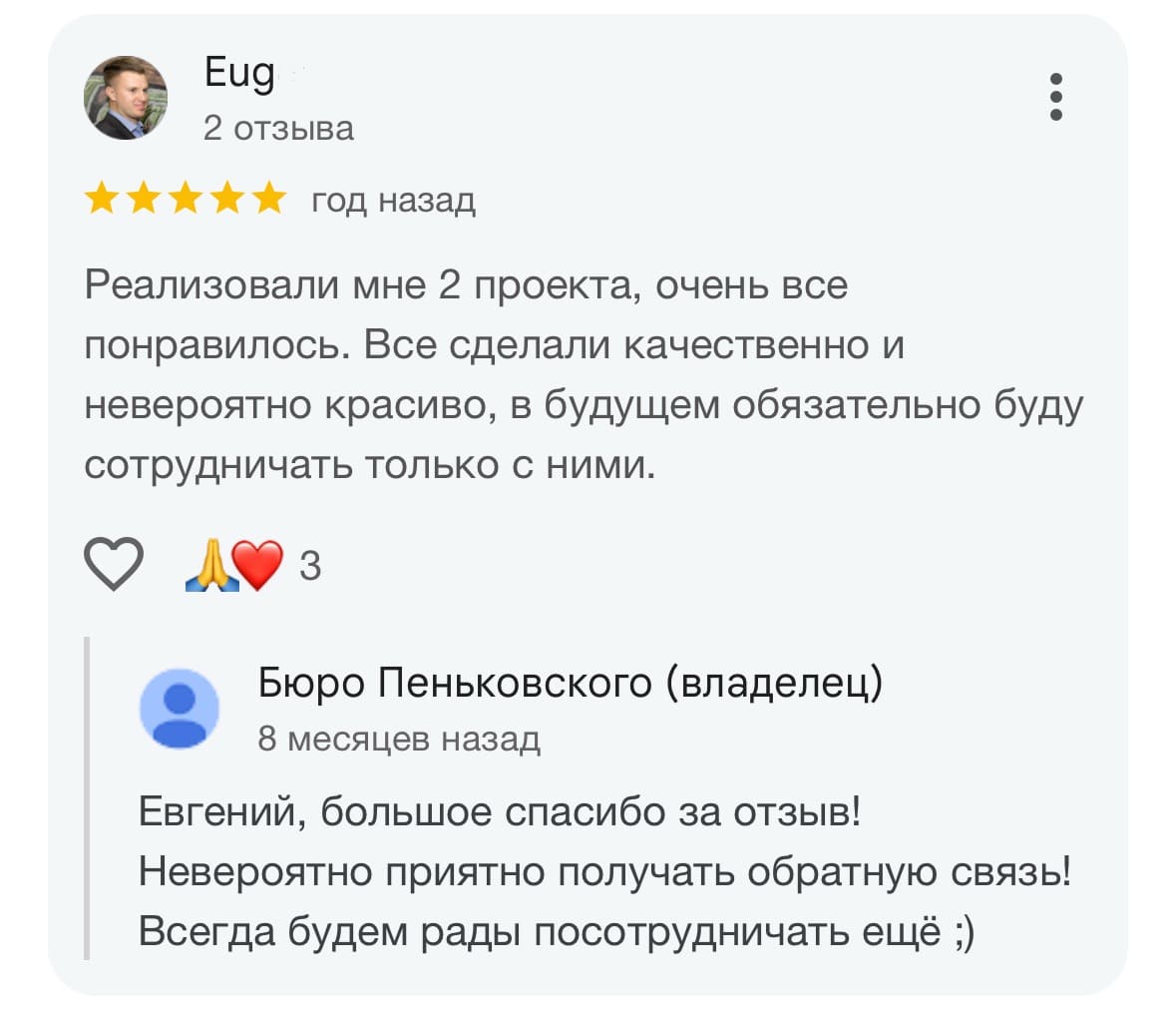 се соответствовало первоначально утвержденной смете. Специалисты «Бюро» - настоящие мастера своего дела. Большое спасибо «Бюро Пеньковского» за отличную работу!