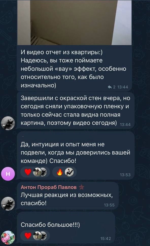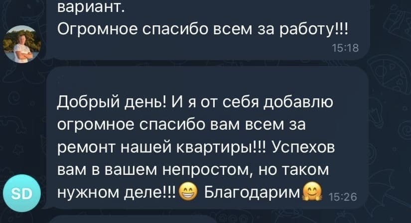 Хочется сказать огромное спасибо ребятам. Качество работы выше выше всяких похвал, но больше всего впечалило внимание и отношение к клиенту. Такой уровень коммуникации, доброжелательности и черства я никогда не встречал. Отдельное спасибо за коммуникацию и помощь после сдачи объекта. Девиз компании: «ремонт для жизни» и это чистая правда. Рекомендую всем!